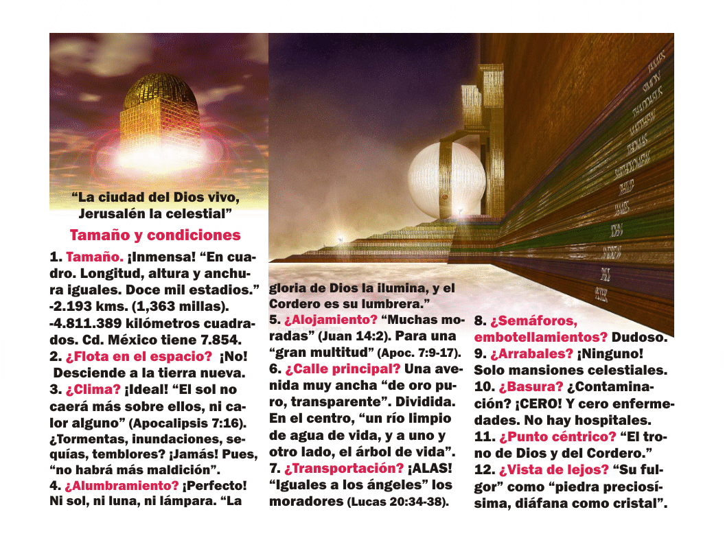 6. ¿Calle principal? Una avenida muy ancha “de oro puro, transparente”. Dividida. En el centro, “un río limpio de agua de vida, y a uno y otro lado, el árbol de vida”.