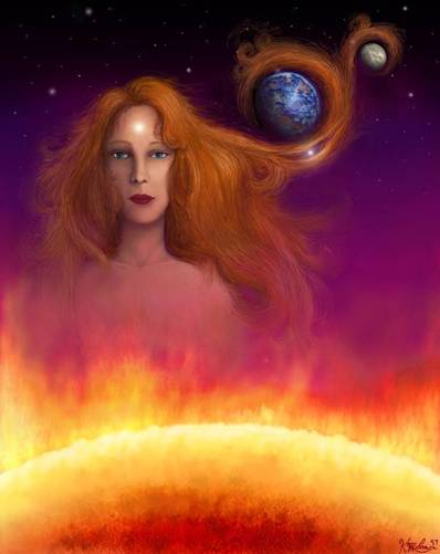 En esta representación gráfica de “la gran ramera”, el sol aparece en primer plano, y detrás del sol, “la mujer que reina sobre los reyes de la tierra”. Su cabello largo escarlata se extiende detrás de ella, por el espacio del sistema solar, alcanzando y cercando al planeta Tierra, y todavía más lejos, a otro cuerpo celestial, dando la impresión de que tuviera ella control sobre ellos, cosa que, por cierto, pretende.
