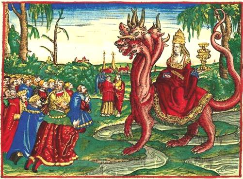 Reflejando los tiempos de la Baja Edad Media, esta pintura enseña a “la gran ramera” sentada sobre “una bestia escarlata… que tenía siete cabezas y diez cuernos”. “La mujer” luce una corona parecida a la “tiara” de los Papas, y sostiene en su mano un gran “cáliz de oro”. A la izquierda, se arrodillan frente a ella reyes, principados y otros potentados en señal de reverencia y sumisión.