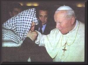 Arafat, líder palestino, de la religión musulmana, besa la mano del Papa. Ejemplo insólito de la influencia del papado católico romano. Pero, esto no condujo a nada, pues los palestinos y demás árabes continuaron sus luchas contra Israel y los judíos en general.