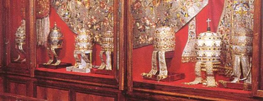 En esta fotografía, se ven siete tiaras papales, cada una con su triple corona. Piedras preciosas incrustadas en cada una. Detalle de una fotografía encontrada en la Página 44 de St. Peter and the Vatican: The Legacy of the Popes –San Pedro y el Vaticano: el legado de los Papas. Por Allen Dunston, O.P., y Roberto Zagnoli. ISBN 0-88397-140-2. www.biblelight.net