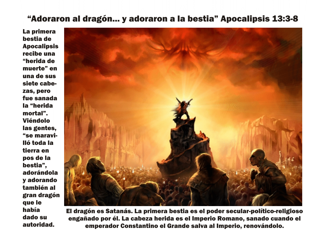 Apocalipsis 13:3-8. "Y se maravilló toda la tierra en pos de la bestia", la cual recibe autoridad del "gran dragón escarlata", o sea, de Satanás.