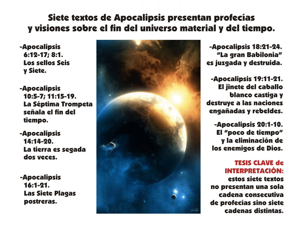 Tesis clave para la interpretación de Apocalipsis: Estos siete textos no presentan una sola cadena consecutiva de profecías sino siete series distintas de profecías, cada una conduciendo al fin del tiempo y del universo material.