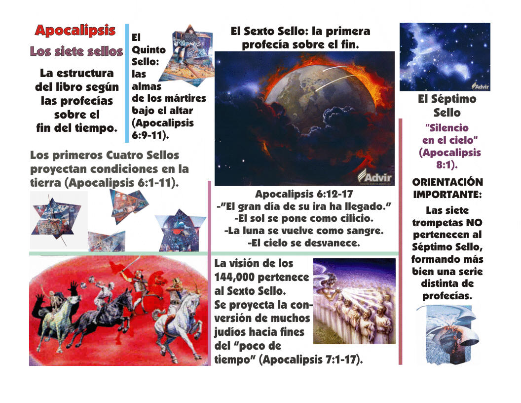 -Los primeros Cuatro Sellos proyectan condiciones en la tierra (Apocalipsis 6:1-11). El Quinto Sello presenta la visión de las almas de los mártires bajo el altar de Dios (Apocalipsis 6:9-11). El Sexto Sello contiene las primeras profecías de Apocalipsis sobre el fin de la tierra, el universal y el tiempo. La visión de los 144,000 pertenece al Sexto Sello, proyectándose la conversión de muchos judíos hacia finales del "poco de tiempo" (Apocalipsis 7:17). El Séptimo Sello. "Silencio en el cielo" (Apocalipsis 8:1). Orientación importantísima: Las Siete Trompetas no pertenecen al Séptimo Sello. No están encerrados en el Séptimo Sello. No siguen consecutivamente a los Siete Sellos.