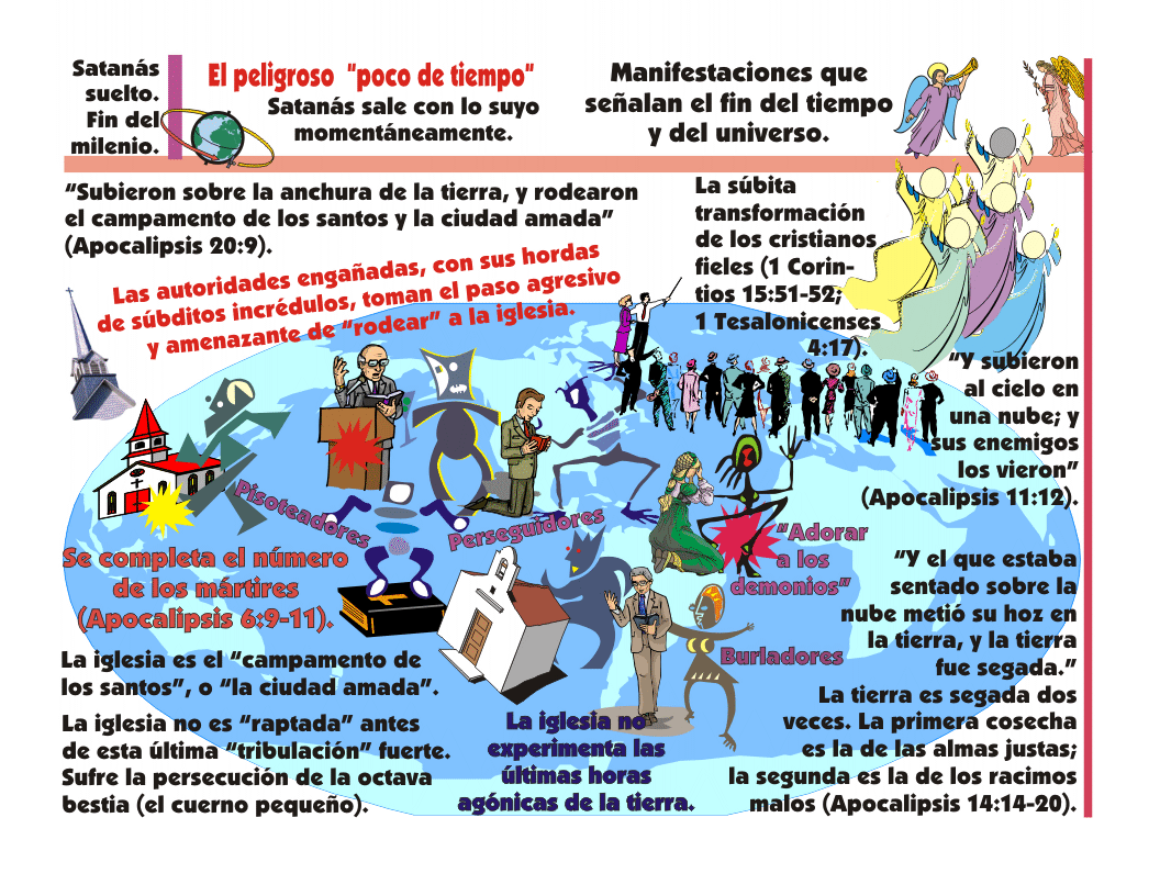 El peligroso "poco de tiempo". Satanás sale con lo suyo momentáneamente. Las fuerzas opuestas a Dios "...subieron sobre la anchura de la tierra, y rodearon el campamento de los santos y la ciudad amada" (Apocalipsis 20:9). Se completa el número de los mártires. La iglesia fiel al Señor no experimenta las últimas horas agónicas del planeta Tierra. La súbita transformación de los cristianos fieles (1 Corintios 15:51-52; 1 Tesalonicenses 4:17; Apocalipsis 11:12).