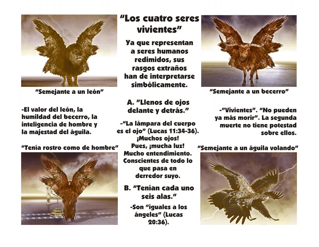 Interpretación de sus rasgos peculiares. "Llenos de ojos delante y detrás." Cada uno tiene seis alas. Uno es "semejante a un león" , otro "a un becerro", otro tiene cara de hombre y el cuarto es "semejante a un águila volando".