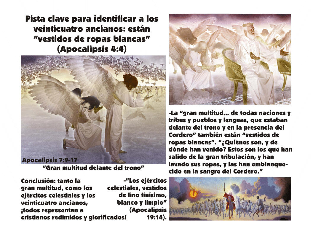 Pista clave para identificar a los veinticuatro ancianos: están "vestidos de ropas blancas". También visten "ropas blancas" los que componen la "gran multitud" y los "ejércitos celestiales". Identidad de la "gran multitud".
