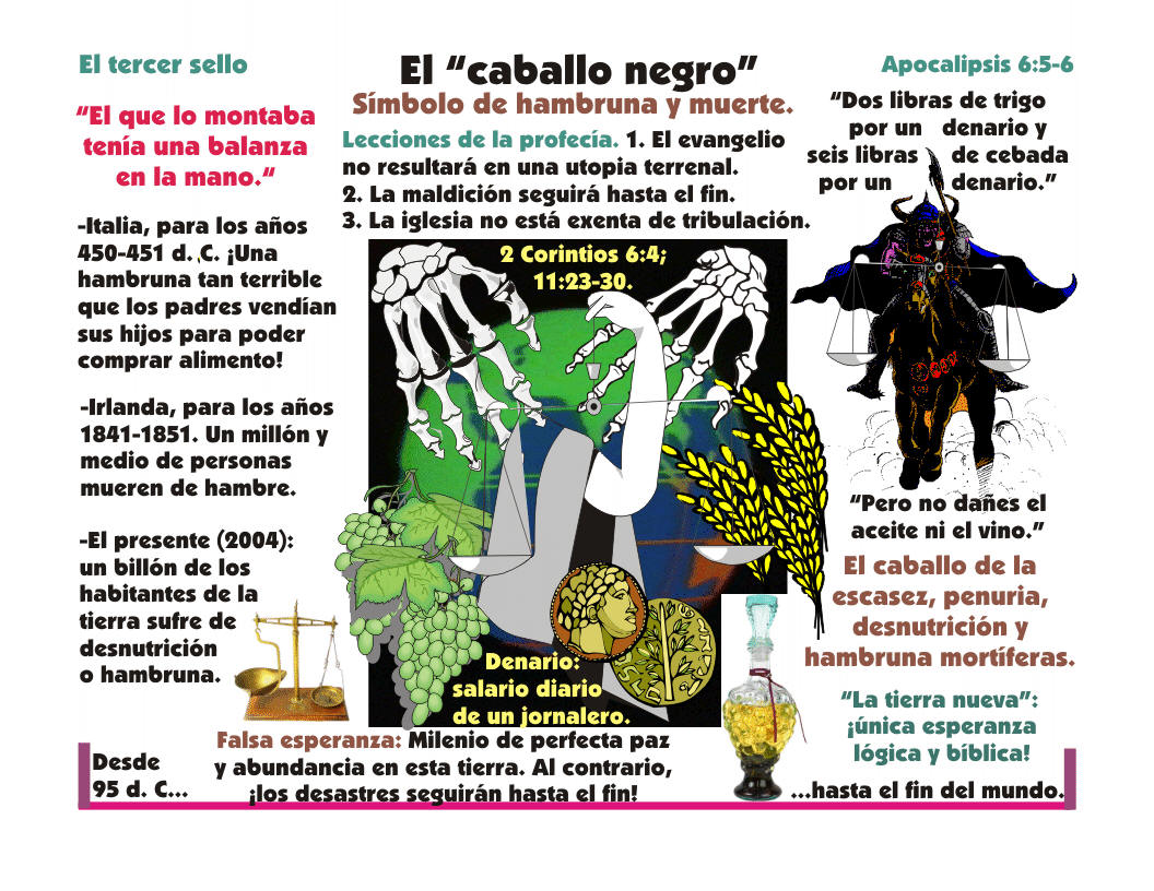 El "caballo negro". Aplicaciones. "El que lo montaba tenía una balanza en la mano." Escasez, penuria, hambrunas y muerte hasta el día de hoy.