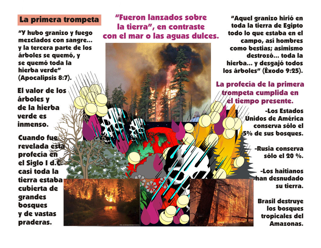 Primera Trompeta. La tierra impactada, en contraste con el mar o el agua dulce. Granizo y fuego mezclados con sangre lanzados sobre la tierra. Cumplimiento de la profecía en el presente.