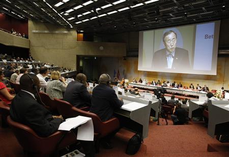Facilidades de las Naciones Unidas en la ciudad de Nueva York, con las banderas de los 192 países pertenecientes. La organización fue establecida el 24 de octubre de 1945. Para el 30 de junio de 2014, 6,389 personas trabajaban en el centro de las Naciones Unidas en Nueva York. La cifra para personal de la organización en todo el mundo ascendió a 41,426.