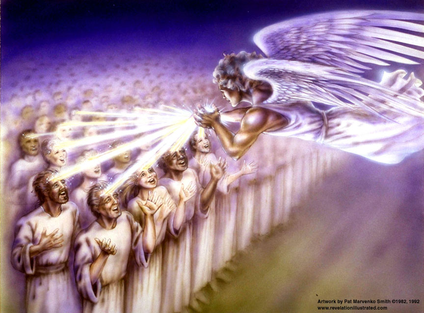 Sellando "en sus frentes a los siervos de nuestro Dios" (Apocalipsis 7:3-8). Pintura por Pat Marvenko. Derechos reservados. www.revelationillustrated.com