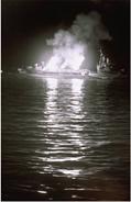 Gran barco de guerra en llamas, a punto de hundirse. www.janesoceania.com