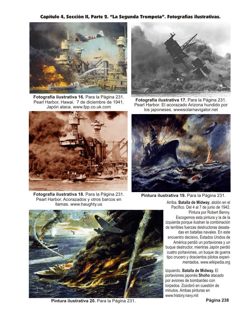 -Página 4 de "Fotografías ilustrativas" para "La Segunda Trompeta". Cinco fotografías. (1) Pearl Harbor, Hawai. 7 de diciembre de 1941. Japón ataca. (2) Pearl Harbor. El acorazado Arizona hundido por los japoneses. (3) Pearl Harbor. Acorazados y otros barcos en llamas. (4) Batalla de Midway, atolón en el Pacífico. Del 4 al 7 de junio de 1942. Pintura por Robert Benny. Escogemos esta pintura y la que sigue porque ilustran la combinación de terribles fuerzas destructoras desatadas en batallas navales. En este encuentro decisivo, Estados Unidos de América perdió un portaviones y un buque destructor, mientras Japón perdió cuatro portaviones, un buque de guerra tipo crucero y doscientos pilotos experimentados. (5) Batalla de Midway. El portaviones Shoho atacado por aviones de bombardeo con torpedos. Zozobró en cuestión de minutos. Pintura por Robert Benny.