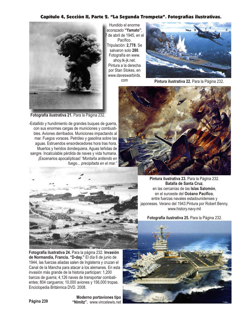 -Página 5 de "Fotografías ilustrativas" para "La Segunda Trompeta". Cinco fotografías. (1) Hundido el enorme acorazado japonés “Yamato” , 7 de abril de 1945, en el Pacífico. Tripulación: 2,778. Se salvaron solo 280. (2) Aviones atacan al “Yamato” . Pintura por Stan Stokes. (3) Batalla de Santa Cruz , en las cercanías de las Islas Salomón, en el suroeste del Océano Pacífico, entre fuerzas navales estadounidenses y japoneses. Verano del 1943. Pintura de Robert Benny. Estallido y hundimiento de grandes buques de guerra, con sus enormes cargas de municiones y combustibles. Aviones derribados. Municiones impactando al mar. Fuegos voraces. Petróleo y gasolina sobre las aguas. Estruendos ensordecedores hora tras hora. Muertos y heridos dondequiera. Aguas teñidas de sangre. Incalculable pérdida de naves y vida humana. ¡Escenarios apocalípticas! “Montaña ardiendo en fuego… precipitada en el mar…” (4) Invasión de Normandía , Francia . “D-day.” El día 6 de junio de 1944, las fuerzas aliadas salen de Inglaterra y cruzan el Canal de la Mancha para atacar a los alemanes. En esta invasión más grande de la historia participan: 1,200 barcos de guerra; 4,126 naves de llevar combatientes a las playas; 804 naves transportes; 10,000 aviones; 156,000 tropas, de los cuales 132,500 fueron llevadas en barcos. (5) Moderno portaviones tipo “Nimitz”.